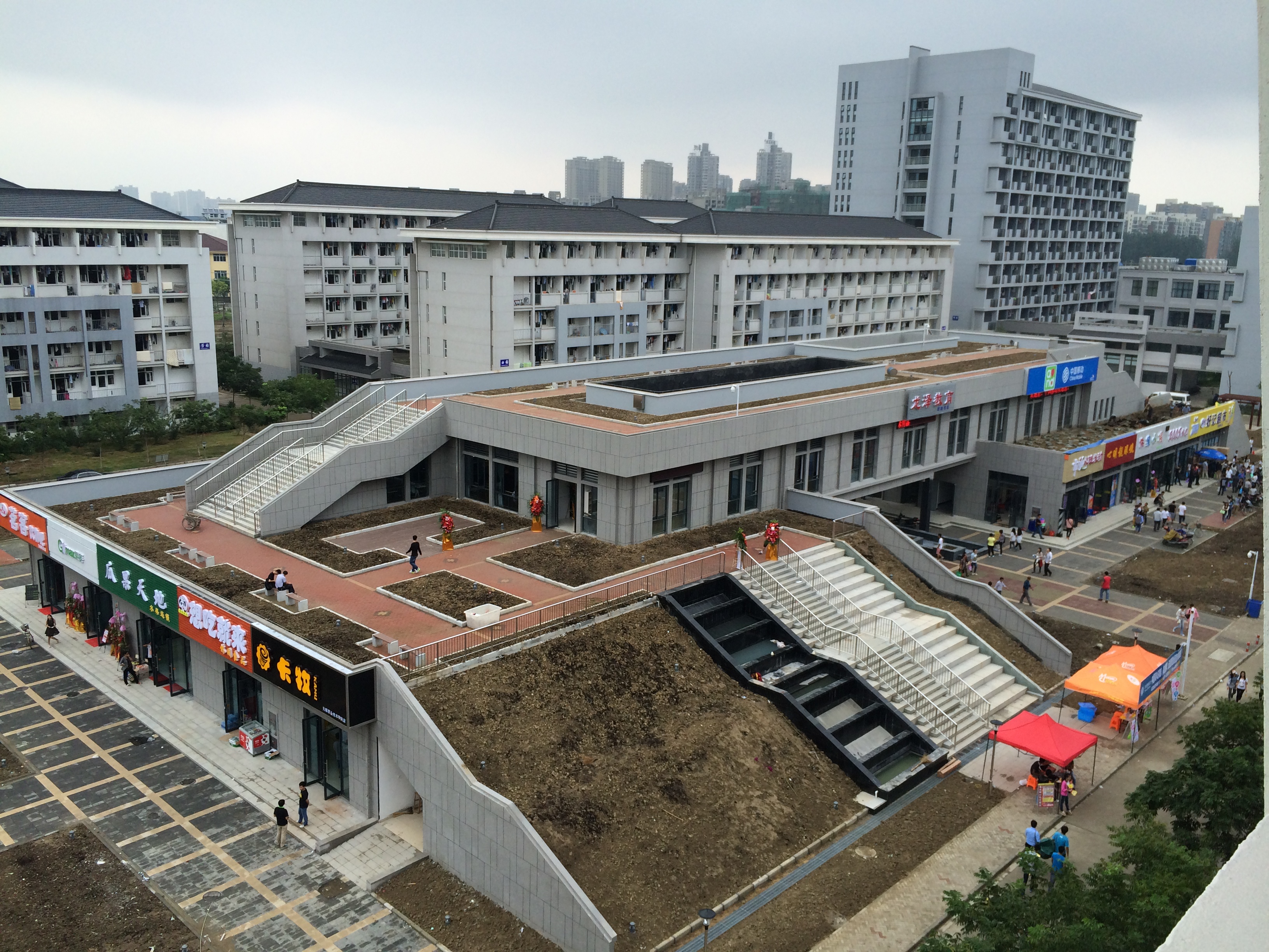 学生生活广场项目是学校党委践行“十二五规划”中提出的努力把我校建设成为“企业的伙伴、学生的家园”目标而打造的提高学生后勤服务能力的项目。该项目位于学生宿舍区中央,采用“生态校园”的设计理念,结合建筑本身与硬质铺装、集中绿化及屋顶绿化为核心的景观设计原则,打造“隆起的草坡”。建筑风格现代、简约。学生生活广场充分发挥了校园特有的自然条件,在满足提供学生室外活动、集会、自由交流的空间前提下,还提供了学生在校生活期间的各类便利服务场所。