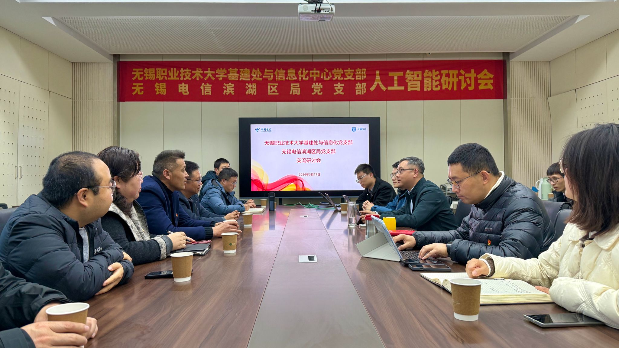 为推动党建与业务深度融合,以技术创新赋能智慧校园建设,3月17日下午,基建处与信息化中心党支部联合无锡电信滨湖区局党支部,在电信滨湖区局党建活动室开展“党建引领聚合力 AI赋能促发展”主题党日活动。双方党员代表及技术骨干参会,通过专题研讨、技术交流凝聚共建共识。